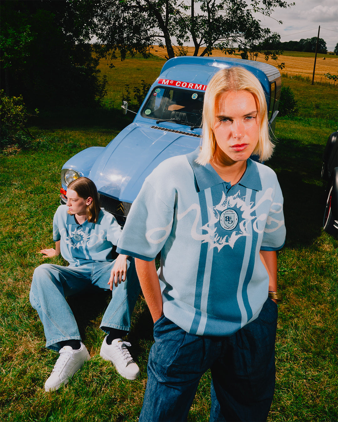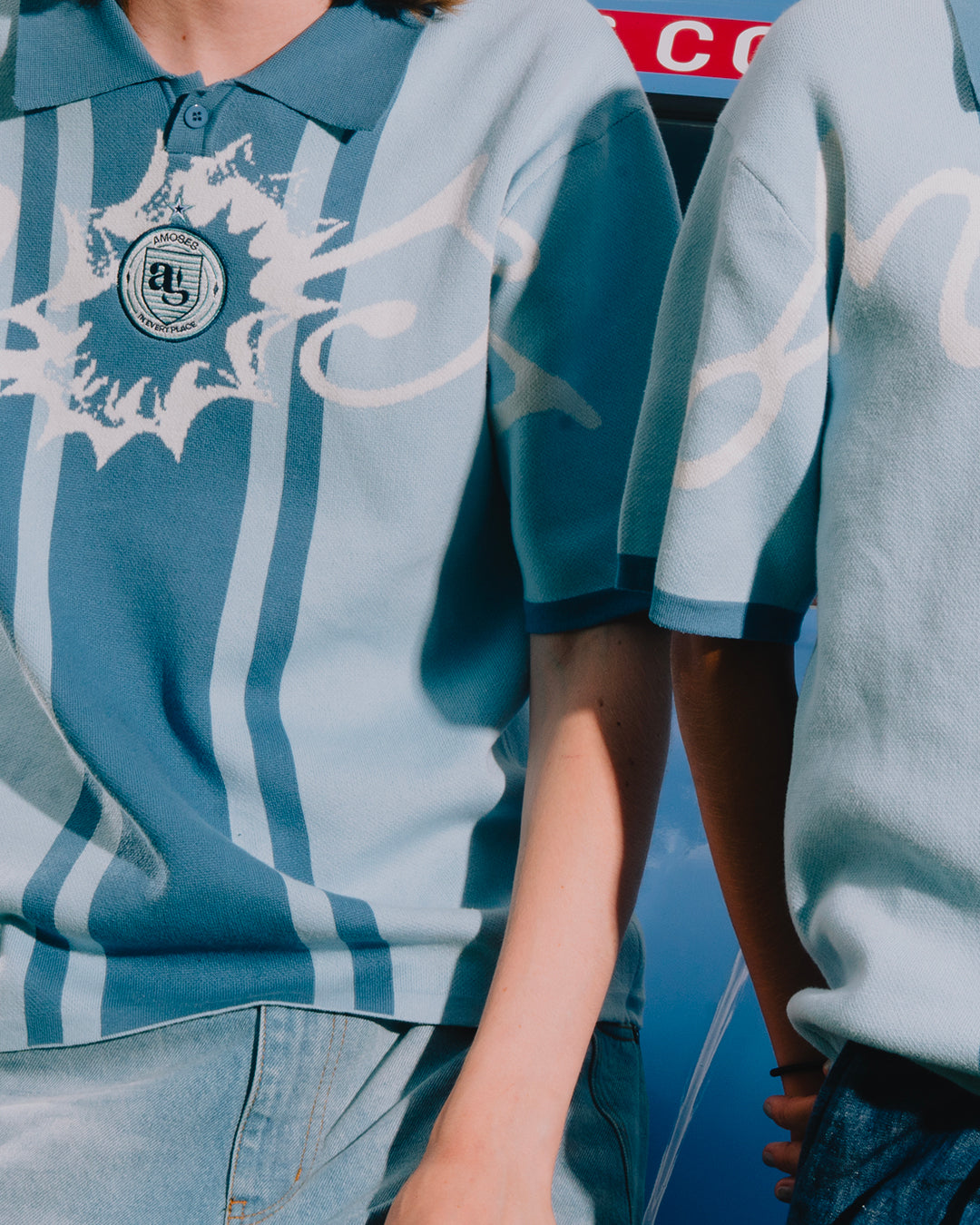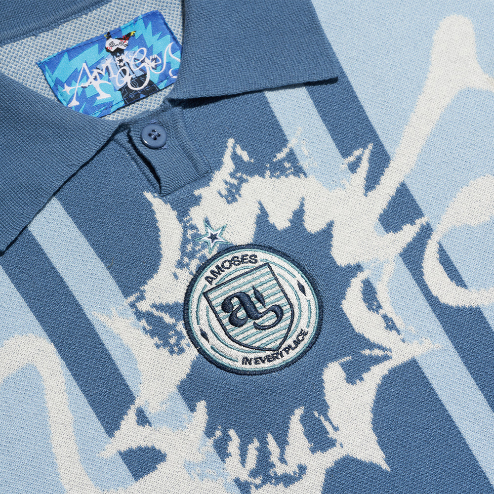 Une typographie tricotée s'étend sur toute la largeur du vêtement, avec des raccords aux manches. Le logo du Amoses Club est brodé au centre.
